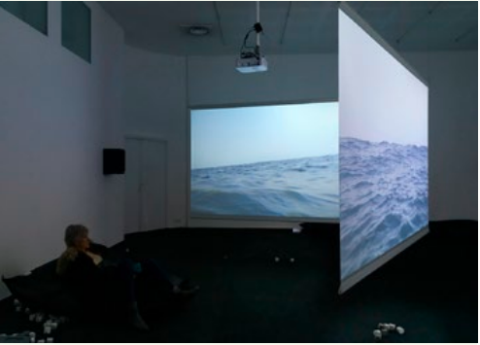 Installation immersive composée de six écrans et d’un dispositif sonore à travers laquelle le visiteur déambule. Chaque écran diffuse des extraits d’un film qui plonge le spectateur au cœur de la dérive d’une embarcation sur l’Atlantique, à proximité de Gorée, île située dans la baie de Dakar, au Sénégal. Gorée, ayant successivement été sous domination portugaise, néerlandaise, anglaise et française, fut du 15e au 19e siècle le plus grand centre de commerce d’esclaves de la côte africaine. Le film offre la perspective de l’océan qui, avec l’élévation de son niveau due au réchauffement climatique, efface peu à peu l’île et son histoire. L’océan y est le personnage central : ses mouvements, son ressac et ses habitants sont accompagnés par la voix du chanteur et compositeur Wasis Diop. Celui-ci mêle ses récits, en wolof et en français, ainsi que ses chants inspirés de la tradition lébou, aux nappes sonores de Valentin Ferré, plasticien sonore.
