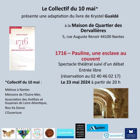 Métisse à Nantes - au nom du Collectif du 10 mai, a adapté le livre 1716 - Pauline, une esclave au couvent (éditions Midi Pyrénéennes) sous la forme d'une courte pièce de théâtre qui sera jouée le 23 mai prochain à la Maison de Quartier des Dervallières à Nantes.