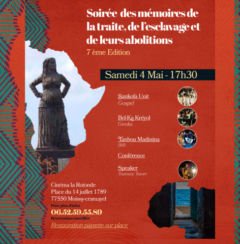 L'association solidarité africaine de Sénart organise sa soirée des mémoires de la traite, de l'esclavage et de leurs abolitions, le samedi 4 mai à partir de 17h30.