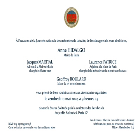 Adjointe à la Maire de Paris chargée de la mémoire et du monde combattant, organisent une cérémonie commémorative le vendredi 10 mai 2024 à 9h45. La cérémonie se déroulera devant la statue Solitude puis devant la sculpture des fers brisés du jardin Solitude.