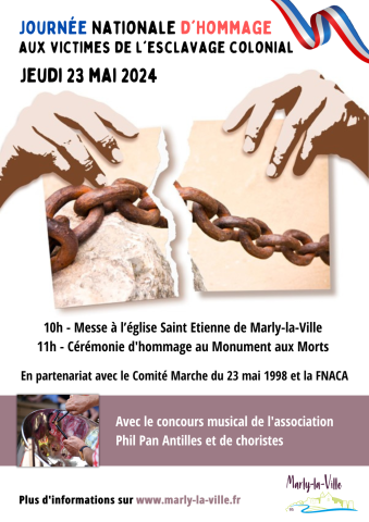 La ville de Marly-la-Ville, ,organise le le 23 mai 2024 une cérémonie en hommage aux victimes de l’esclavage colonial.