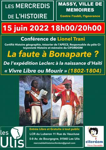 Le 15 juin à 18h, aux Ulis, Lionel Trani animera une conférence sur le thème : "La faute à Bonaparte ? De l'expédition Leclerc à la naissance d'Haïti, "Vivre Libre ou Mourir" (1802-1804).