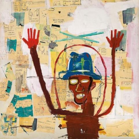 Si les rappeurs se présentent alors comme les petits-fils des be-boppeurs, le jazz occupe aussi une place essentielle dans la peinture de Basquiat. L’artiste s’inscrit ainsi dans l’héritage culturel noir new-yorkais qui le rattache à une généalogie artistique sans équivalent dans le champ des beaux-arts. Hantée par la destinée tragique de Charlie Parker, figure du génie foudroyé, son œuvre regorge de références aux disques et aux musiciens de jazz. Sa compréhension du genre modifie en profondeur la composition de ses tableaux. Du delta du Mississippi, terre de naissance du blues, aux côtes de l’Afrique en passant par la Caraïbe à laquelle le rattachent ses ascendances haïtienne et portoricaine, l’œuvre de Basquiat explore l’Atlantique noir, ce continent immatériel et diasporique où la musique est un lieu de mémoire : elle témoigne d’un continuum spirituel à travers les âges, qu’incarne la figure ancestrale du griot.
