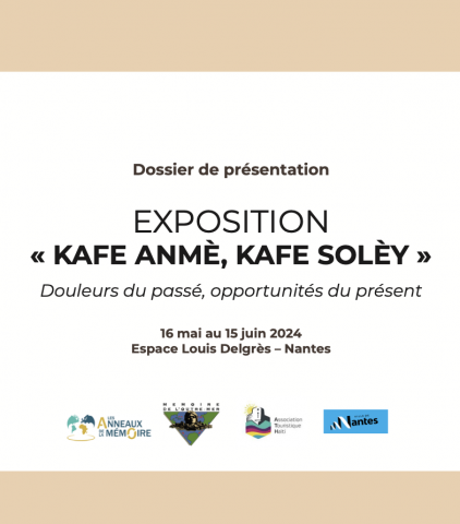 Du 16 mai au 15 juin 2024, la Délégation permanente d’Haïti auprès de l’UNESCO et l’Association touristique d’Haïti (ATH) présentent à l'espace Louis Delgrès à Nantes, l’exposition « KAFE ANMÈ, KAFE SOLÈY - Douleurs du passé, opportunités du présent » avec le soutien des Anneaux de la Mémoire et de l'Association Mémoire de l'Outre-Mer.