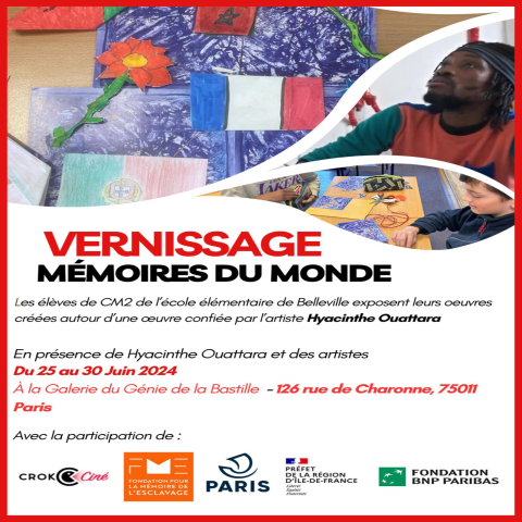 Les élèves de CM2 de l'école élémentaire de Belleville exposent leurs oeuvres créées autour d'une œuvre confiée par l'artiste Hyacinthe Ouattara. En présence de Hyacinthe Ouattara et des artistes du 25 au 30 Juin 2024, à la Galerie du Génie de la Bastille - 126 rue de Charonne, 75011 Paris.