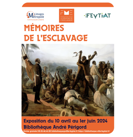 Du 10 Avril au 01 juin 2024, l'exposition " Mémoire de l'esclavage" est présente à la bibliothèque municipale de Feytiat. L'exposition Mémoires de l’esclavage permet d’appréhender en images et de manière pédagogique les siècles d’asservissement et la façon dont ils s’inscrivent dans notre récit national.