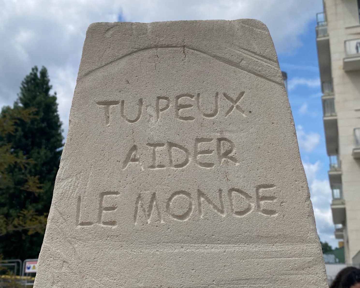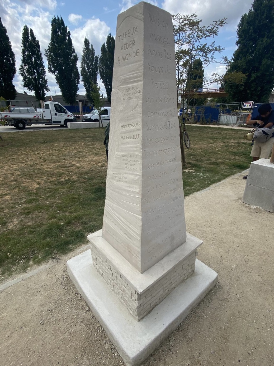 Sur la sculpture sont gravés les mots de l’artiste ainsi que ceux de jeunes de Bondy et de Seine-Saint-Denis receuillis lors d’ateliers de poésie et de gravure menés par Kuamen.