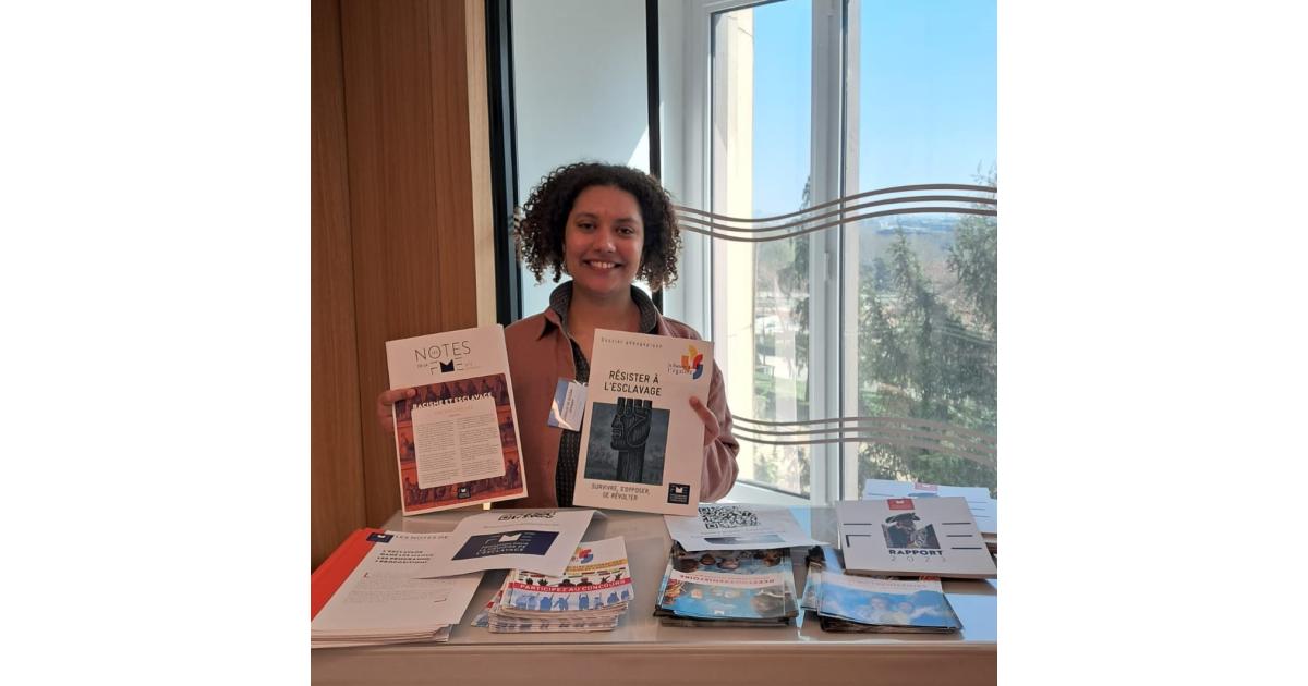A l'occasion du Séminaire « Mémoire et EAC » le 27 mars 2025 proposé par le Programme national de formation 2024-2025 (PNF) pour le personnel du Ministère de l'éducation nationale, de l'enseignement supérieur et de la recherche, Coralie de Souza Vernay, responsable Patrimoine & Recherche de la FME a rencontré les participants sur un stand de la FME.