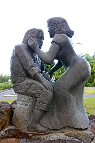 Sculpture en basalte de Marco Ah-Kiem, artiste réunionnais, l'œuvre a été taillée dans un seul bloc de pierre. Elle représente Heva, marronne réunionnaise, pansant les plaies de son époux, Anchaing, également marron.