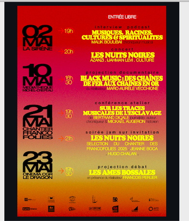 2 Projections « Black music, des chaînes de fer aux chaînes en or » de Marc Aurèle VECCHIONE à la Médiathèque Michel-Crépeau et « Les Âmes Bossales » de François PERLIER au CGR La Rochelle Dragon.