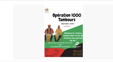 La Ville du Diamant a le plaisir de vous inviter à la manifestation "Opération 1000 Tambours", mercredi 22 mai 2024, de 07 heures à 09 heures à la Place de l'Eglise dans le cadre de la commémoration de l'abolition de l'esclavage, le 22 mai 1848.
