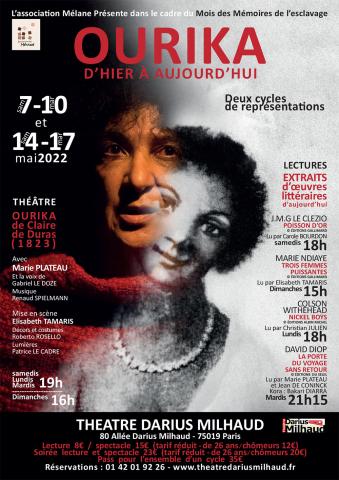 Crée en 2016 d’après le roman de Claire de Duras (1823), le spectacle OURIKA raconte l’histoire authentique et incroyable d’une petite sénégalaise arrachée à l’esclavage puis élevée au sein de l’aristocratie de la fin du 18ème siècle. La découverte une fois jeune adulte de son irréductible différence- la seule couleur de sa peau - et du rejet que cela signifie dans cette société qui lui a pourtant dispensé la meilleure éducation, la mènent au désespoir et à la mort.