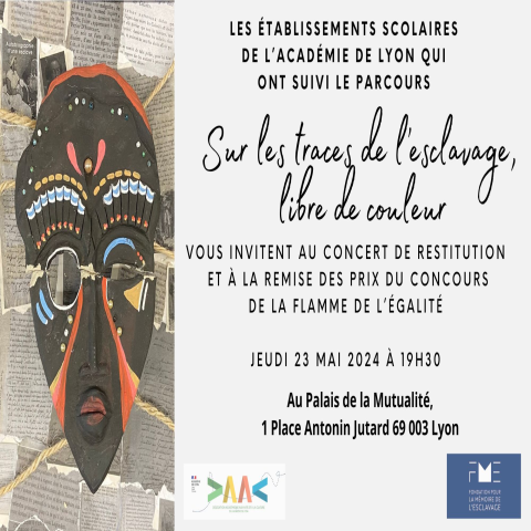 Les établissements scolaires de l'Académie de Lyon qui ont suivi le parcours : Sur les Traces de l'Esclavage, libre de couleur, organisent un concert de restitution et une remise des prix du concours de la Flamme de l'Égalité le jeudi 23 mai 2024 à 19h30 au Palais de la Mutualité, 1 Place Antonin Jutard 69003.
