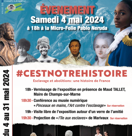 La ville de Champs-sur-Marne organise le vernissage de l'exposition #C'ESTNOTREHISTOIRE, Esclavage et abolitions : une histoire de France. Le vernissage aura lieu à 18h en présence de Maud Tallet, Maire de Champs-sur-Marne et sera suivi d'une conférence au musée numérique